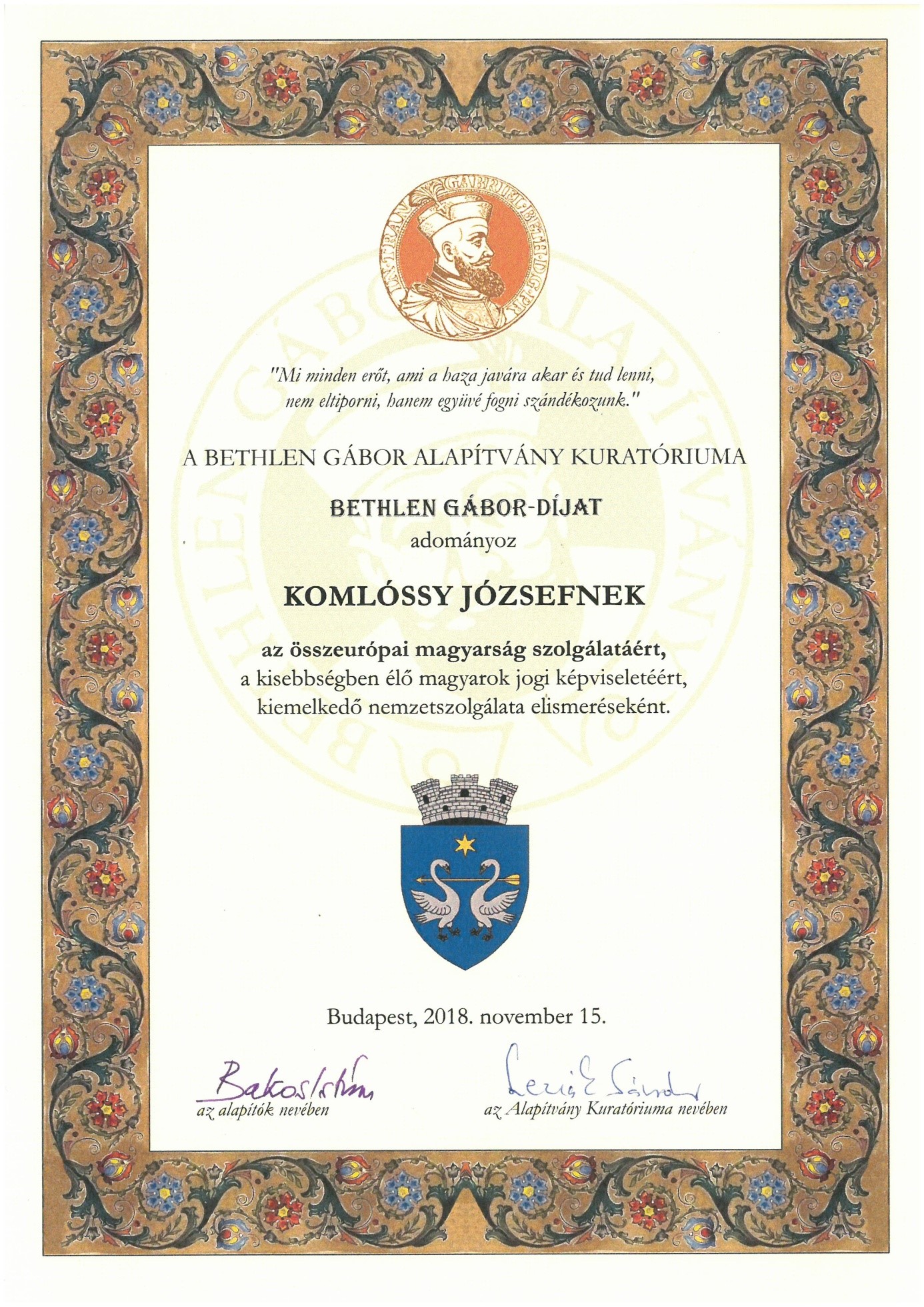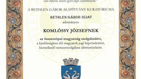 A Bethlen Alapítvány díjat adott át a magyar társadalom kimagasló segítőinek. A Bethlen-díjat Komlóssy József kapta, ami Sopronból vándorolt ki Kanadába 1956-ban. Az erdőmérnökként dolgozó Komlóssy a kárpát-medencei magyar kisebbségeket védő aktivistaként is fellépett az évek során, beszélt az ENSZ-ben és más szervezetek előtt is a magyarság védelmében.