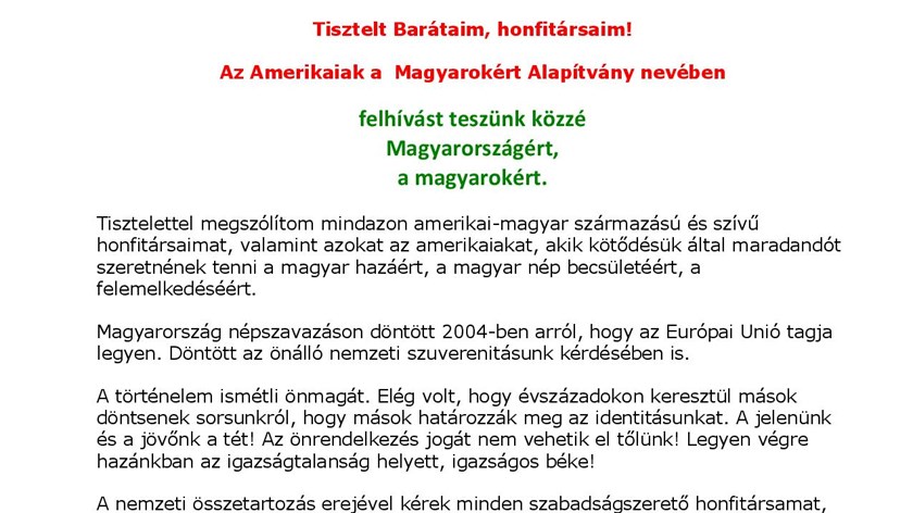 Tisztelettel megszólítom mindazon amerikai-magyar származású és szívű