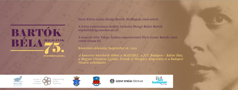 A pandémia körülményei között a megemlékezésnek sajátos módját választottuk. A nemzetközileg elismert Szent Efrém kórus közönség nélküli koncerten előadja Bartók Férfikarok című művét a Magyar Unitárius Egyház Magyarországi Egyházkerület Bartók Béla Egyházközségének templomában, Budapesten, a Hőgyes Endre utcában. A kórus műsorszámai mellett Szokolay Dongó Balázs Bartók népdalfeldolgozásokat ad elő.